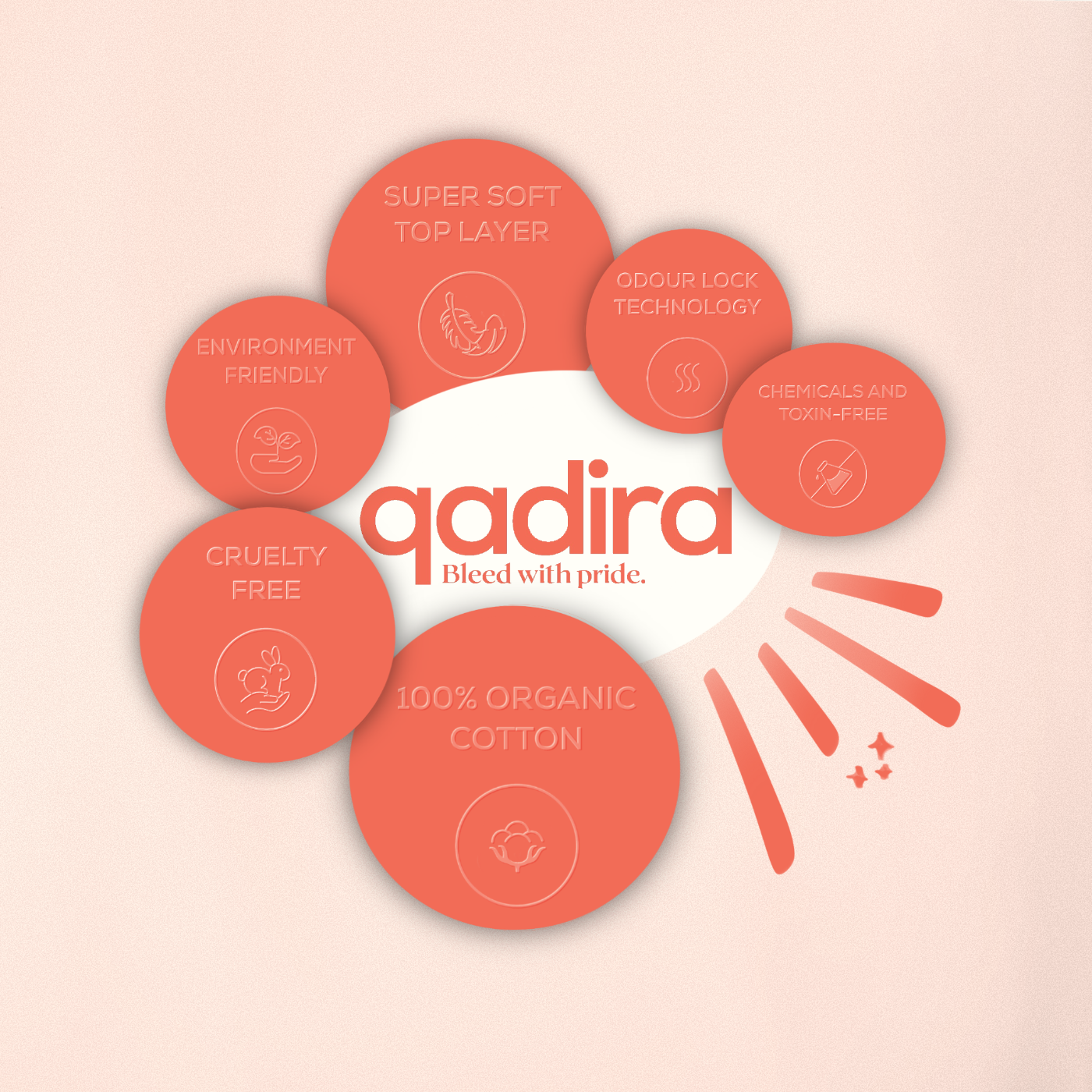 A soothing solution to your periodic chaos! Our sanitary pads are ultra-thin and come with nine-layer protection. A pack of twenty comes with disposable bags to provide you with a hassle-free and satisfying menstrual journey. Qadira Hygiene pads are made in India and part of every purchase made goes to the Qadira project that progresses towards social change!